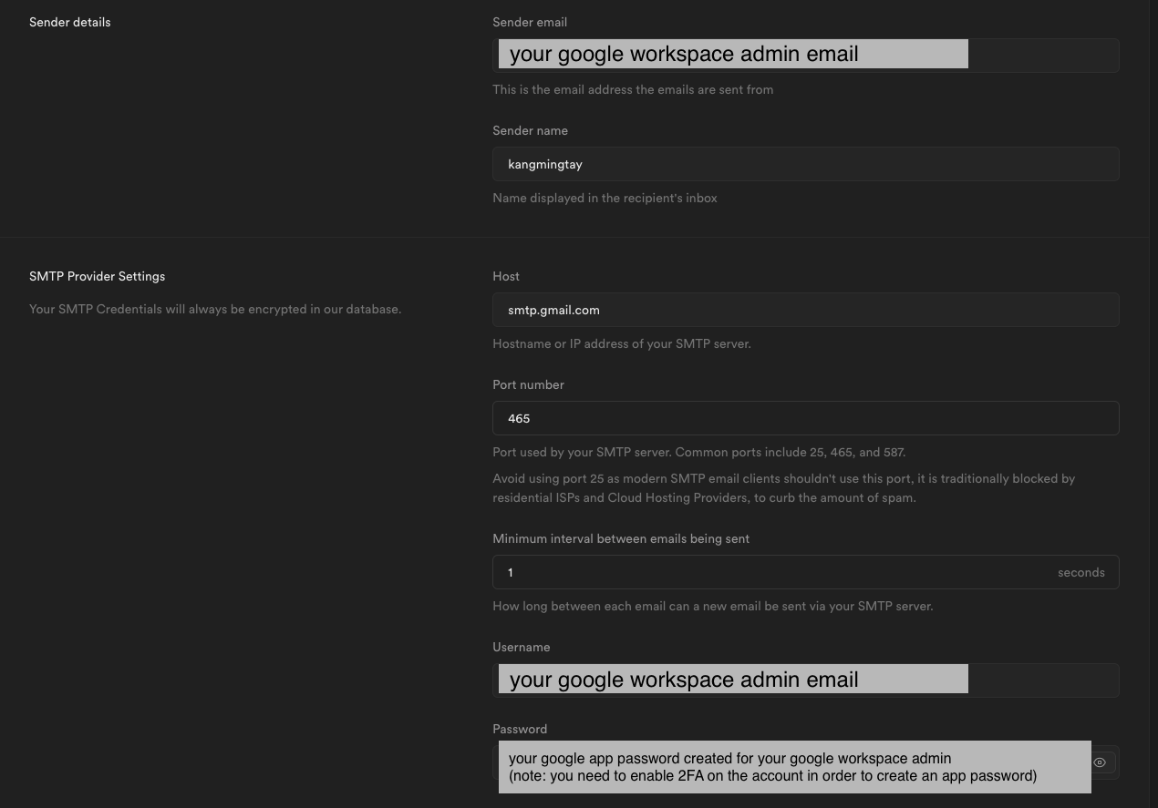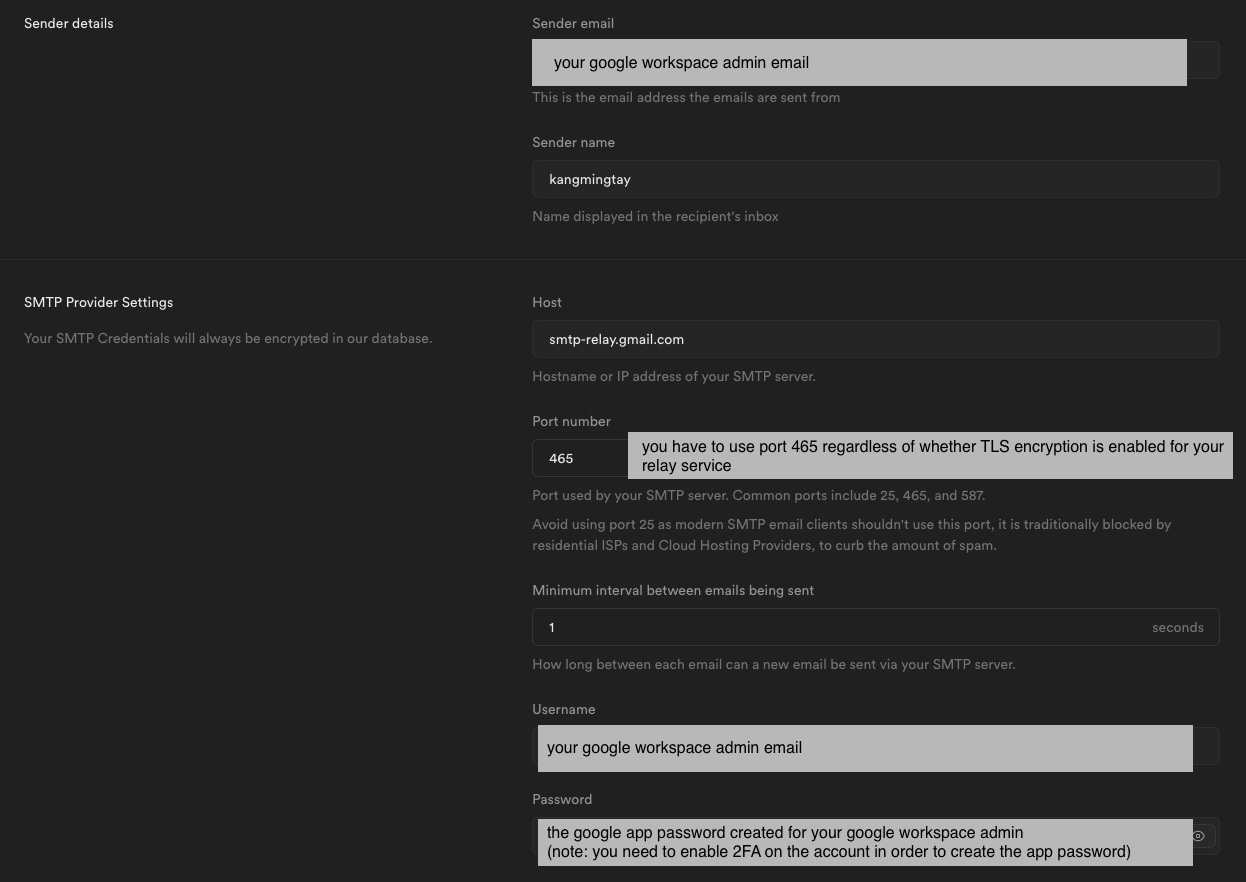 2. The SMTP password used has to be an app password. Google workspace doesn't make it easy to to figure out how to create this. You need to enable 2FA on your workspace account first (not inside the admin console but in https://myaccount.google.com/)